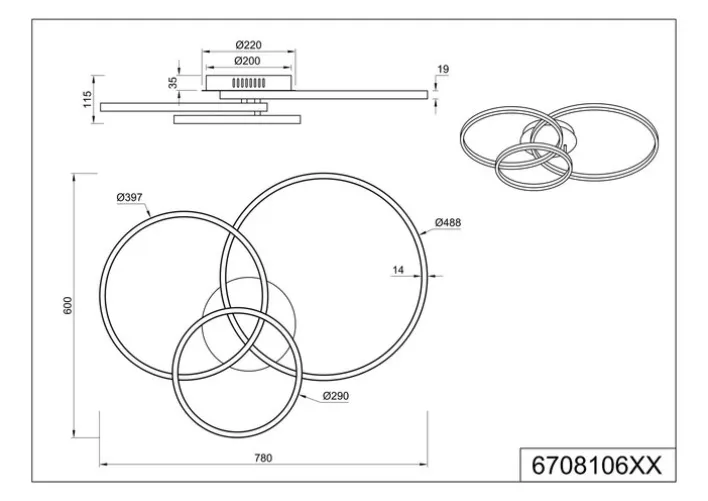 Diese Deckenleuchte aus schwarzem und weißem Kunststoff beziehungsweise Metall hat eine Breite von 60 cm, eine Länge von 78 cm sowie eine Höhe von 11,5 cm. Sie verfügt über eine fest eingebaute LED, die eine maximale Lichtleistung von 3.200 Lumen aufweist und höchstens 27 Watt verbraucht; die Farbtemperatur liegt zwischen 2.700 und 6.500 Kelvin. Die Lampe lässt sich per mitgelieferter Fernbedienung dimmen und verfügt auch über eine RGBW-Farbverstellung.