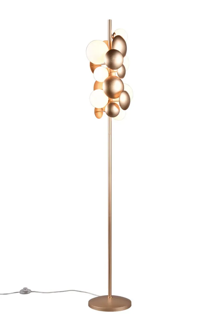 Die Stehlampe TRS BUBBLE von TRIO ist eine Lichtquelle mit außergewöhnlichem Design. Wie ein Meer aus luftigem Schaum sind hier sanft gerundete Elemente aus Glas und Metall miteinander kombiniert. Insgesamt 8 einzelne Brennstellen sorgen für ein originelles Spiel von Licht und Schatten. Die 155 cm hohe Lampe wird über einen Fußschalter betätigt.