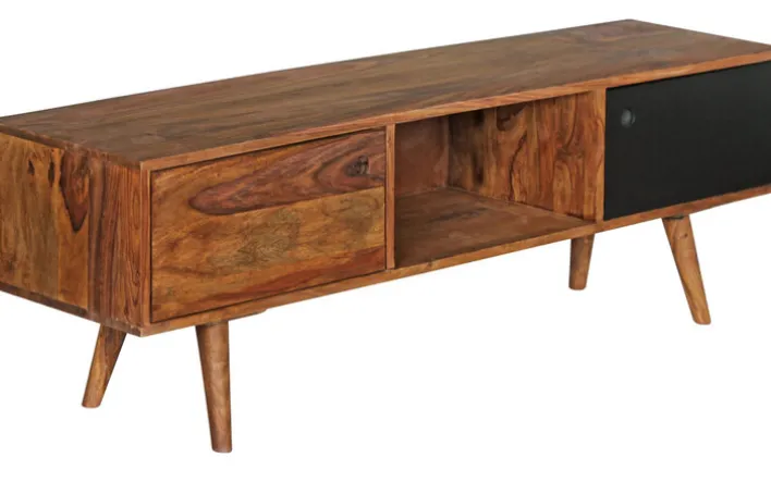Das 140 cm breite und 45 vm hohe TV-Lowboard ist aus massivem, gebeiztem Rosenholz gefertigt. Der warme Farbton und die natürliche Maserung des edlen Materials strahlen Ruhe und Beständigkeit aus. Gleichzeitig vermitteln die hohen, schrägen Füße eine Leichtigkeit. die das Möbelstück zu einem gern gesehenen Accessoire in jedem Raum machen.