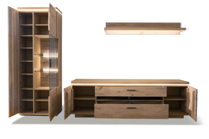 Optisch überzeugt das TV-Lowboard BARCELONA durch die Kombination einer natürlichen Holzmaserung mit geradlinigen Formen. Mit Fronten aus teilmassiver Eiche ist es zudem äußerst stabil. Zwei offene Fächer bieten Raum für SAT-Empfänger und HiFi-Geräte, hinter zwei Drehtüren und in zwei Schubkästen lassen sich TV-Zubehör, CDs und DVDs unterbringen. Eine integrierte Beleuchtung mit langlebigen LEDs und längliche Griffe aus schwarzgrauem Metall unterstreichen die elegante Ausstrahlung des TV-Unterschranks. Besonders stilvoll wirkt er in Kombination mit weiteren Wohnzimmermöbeln aus der BARCELONA-Serie.
