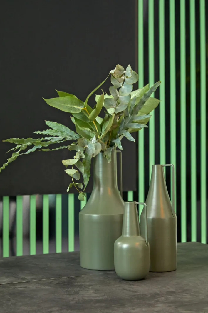 Optisch drängt die Vase nicht in den Vordergrund, sondern überlässt mit ihrem schlichten Grün eher den Blumen und den Sträuchern die Bühne. Besonders helle Blüten können sich gut von der eher dunklen Farbe abheben und auf diese Weise spannende Kontraste entstehen lassen. Die Vase macht sich auf der Kommode gut, aber auch auf dem Fensterbrett oder im Regal setzt sie Akzente. Der Henkel erleichtert den Transport.