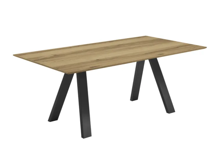 Die Holzqualität der Tischplatte ist eine furnierte Nachbildung der Santanaeiche, inklusive einer hell geölten Oberflächenbeschichtung. Das Tischgestell besteht aus einem abgeschrägten Vierfußgestell aus Metall, welches eine mattgraue Farboptik aufweist. Mit dieser Werkstoffkombination erhält der Nutzer einen vielseitig verwendbaren Tisch für den Wohn- und Esszimmerbereich. Eine Tischverlängerung ist aufgrund der Bauweise nicht möglich.