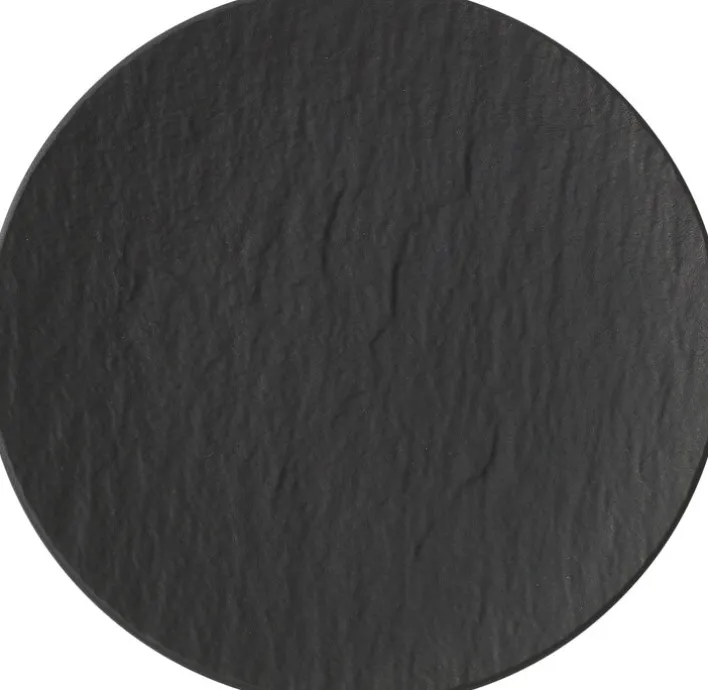 Dieser ausgefallene Teller MANUFACTURE ROCK in der Farbe Schwarzgrau/Schieferstruktur ist aus hochwertigem Premium Porzellan, etwa sechzehn Zentimeter groß und