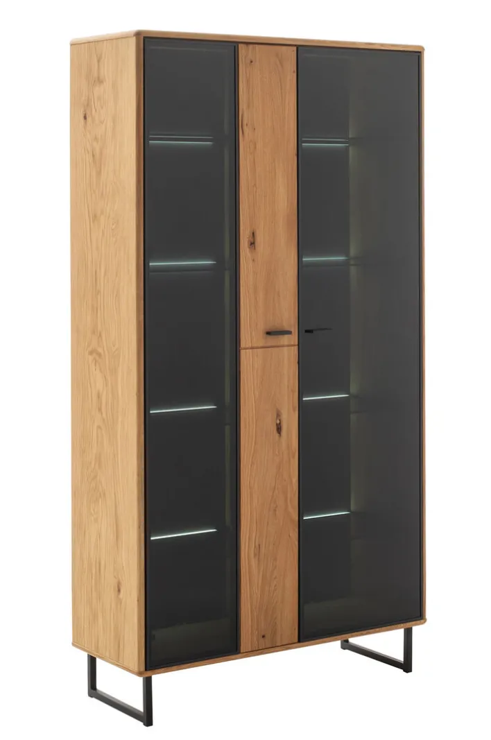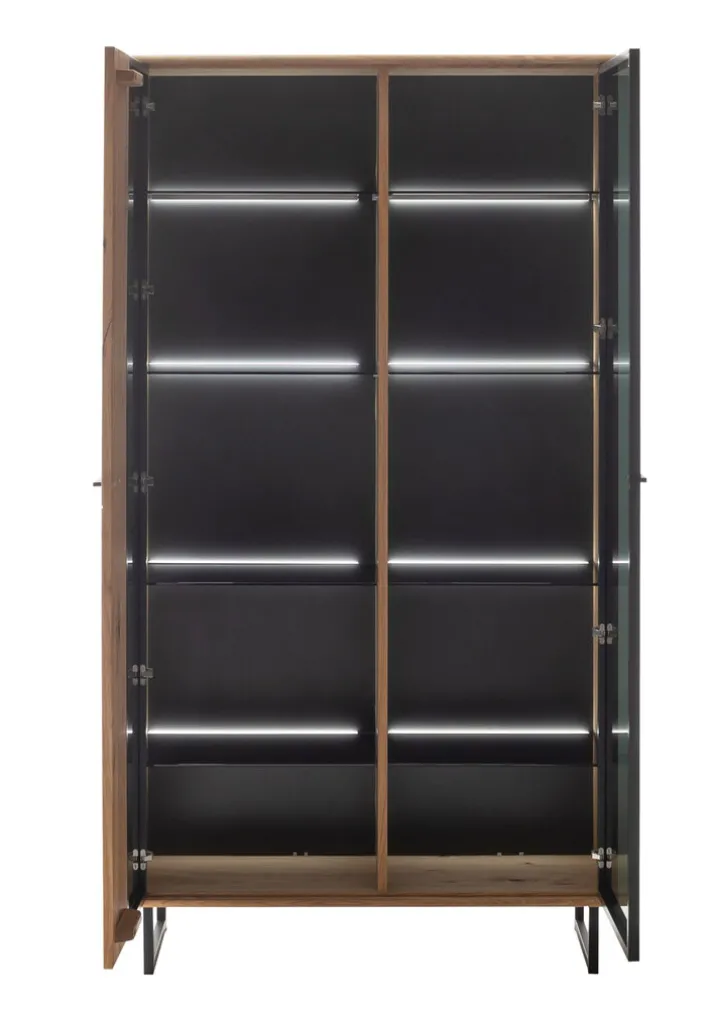 Die Vitrine AREZZO Wildeiche II 100 x 186 cm mit 2 Glasdrehtüren hat eine Tiefe von 38 cm. Sie lässt sich entweder in Wohnwände integrieren oder einzeln in jedem Wohninnenraum platzieren, zum Beispiel im Wohnzimmer. Dort bietet sie viel Stauraum für Dinge, die nicht für jeden sichtbar sein sollen. Das Glas der Türen ist dunkel gefärbt.