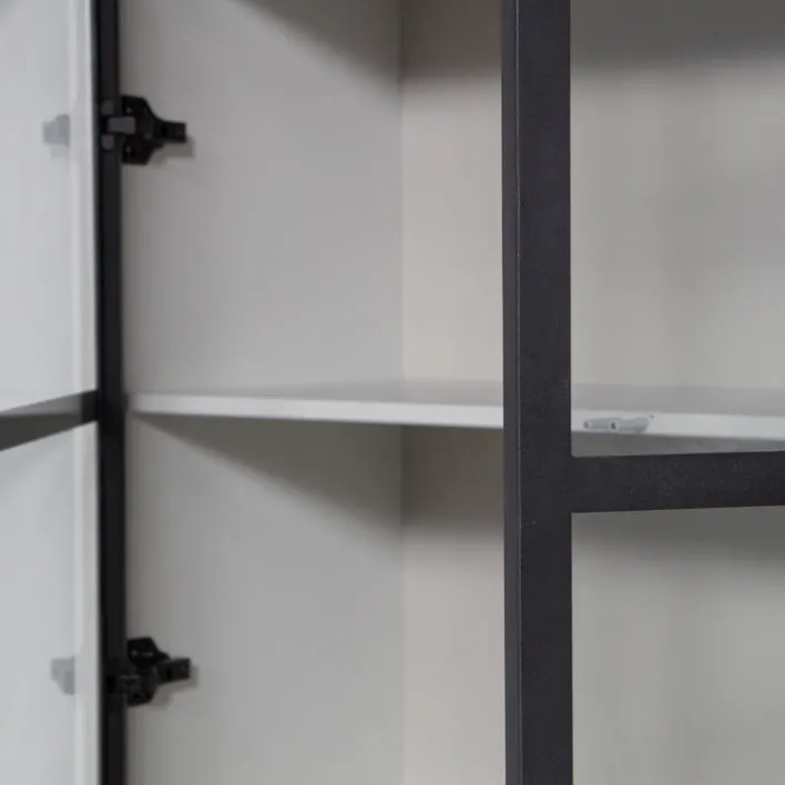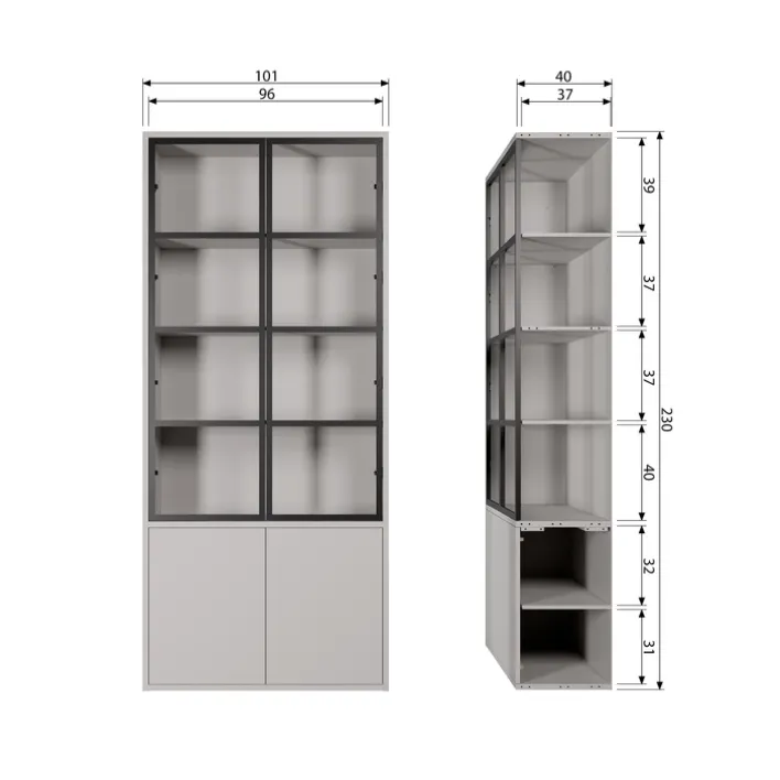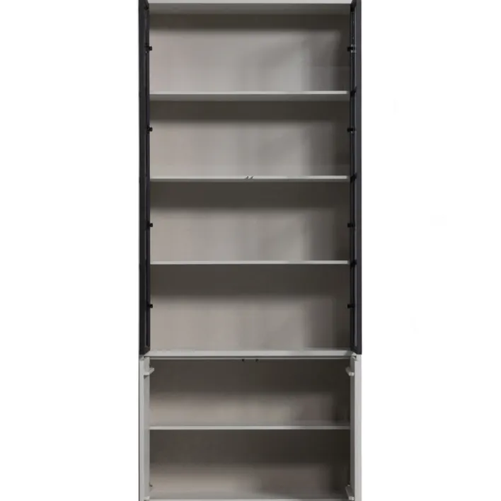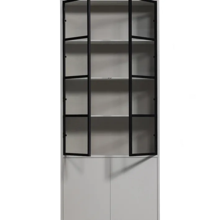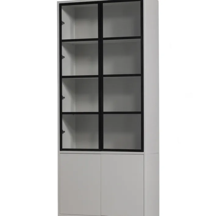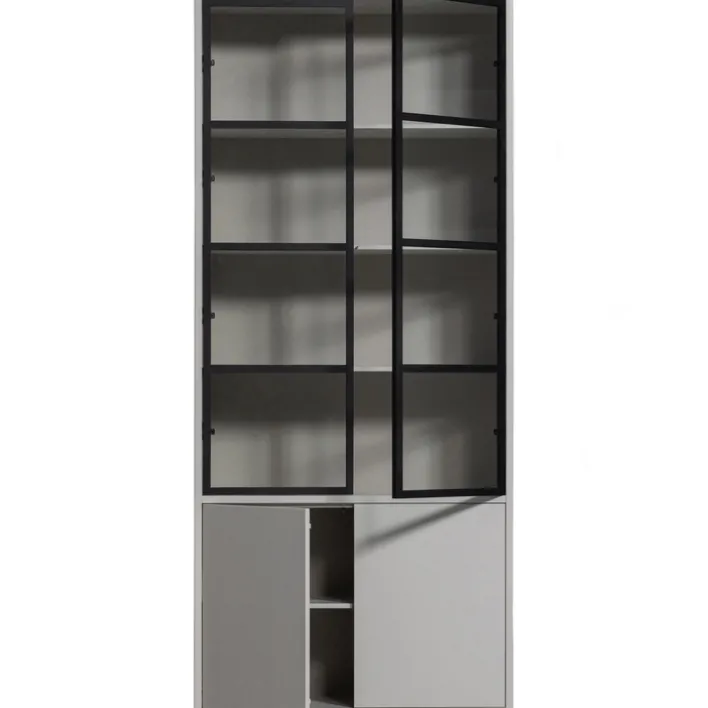 Die 4-türige Vitrine BASIC hat die Maße 101 x 230 cm und punktet mit einer ansprechenden Optik. Dank der Gestaltung in den Farbtönen nebelgrau/schwarz passt die Vitrine in modern eingerichtete Wohn- oder Esszimmer. Hinter den Drehtüren aus Glas mit Metallrahmen ist ausreichend Platz für Gläser, Geschirr, Bücher oder Deko-Accessoires. Im unteren Bereich ist ausreichend Stauraum für die Tischwäsche. Die Vitrine komplettiert die Einrichtung und schafft ein wohnliches Ambiente.