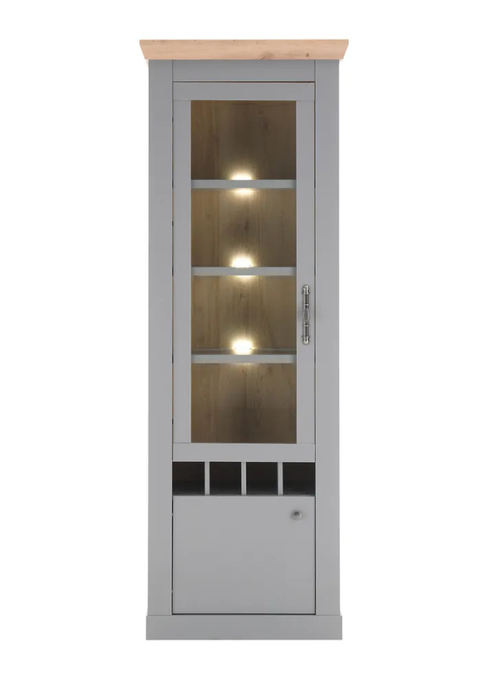 Die hellgrau-braune Vitrine CHAMBORD hat eine Größe von 71 x 201 cm. Sie ist mit einer exklusiven Beleuchtung ausgestattet und zeichnet sich zudem durch die Tür mit Glaseinsatz aus.