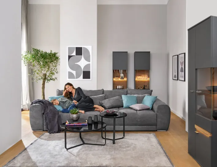 Die graue Vitrine CHARLOTTE mit einer Breite von 80 cm besticht mit einem modernen Design und bietet viel Stauraum. Durch die in Balkeneiche abgesetzte Rückwand strahlt sie trotz stylischem Look Natürlichkeit aus.