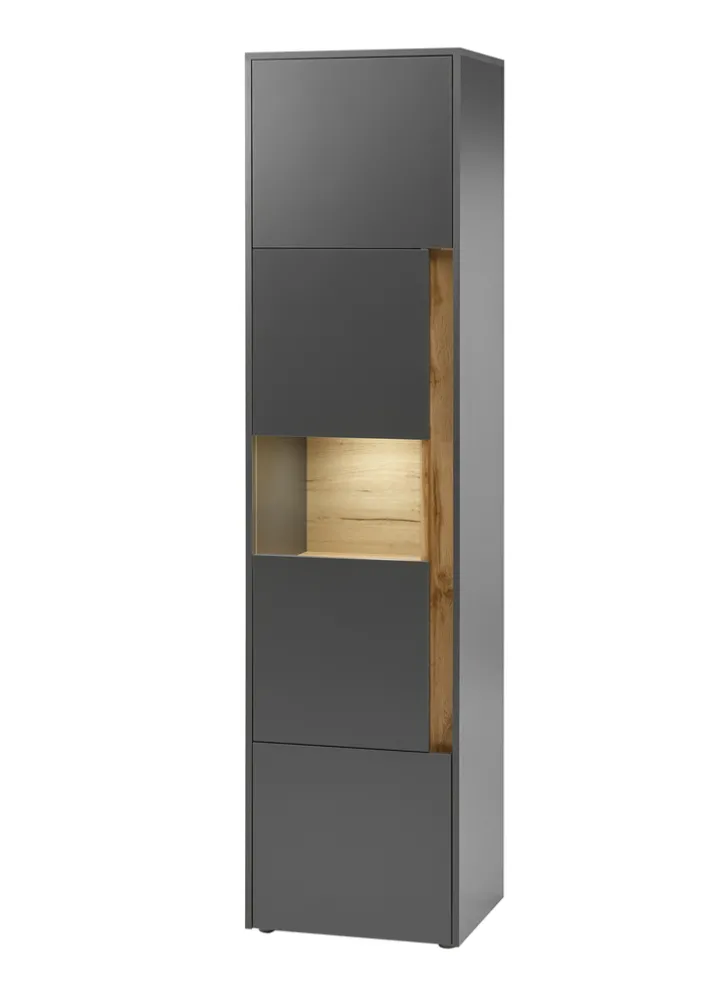 Die weißen Oberflächen der Vitrine bilden einen hervorragenden Kontrast zu den Innenfächern aus Eiche-Dekor. Dank der Tür mit Glas-Einsatz kann man Teile des Innenlebens jederzeit im Blick behalten. Die Vitrine CITY eignet sich somit nicht nur hervorragend für Wohnzimmer und Jugendzimmer, sondern kann auch in Gästezimmern auf ganzer Linie überzeugen. Eleganter Stauraum mit der ganz besonderen Note.