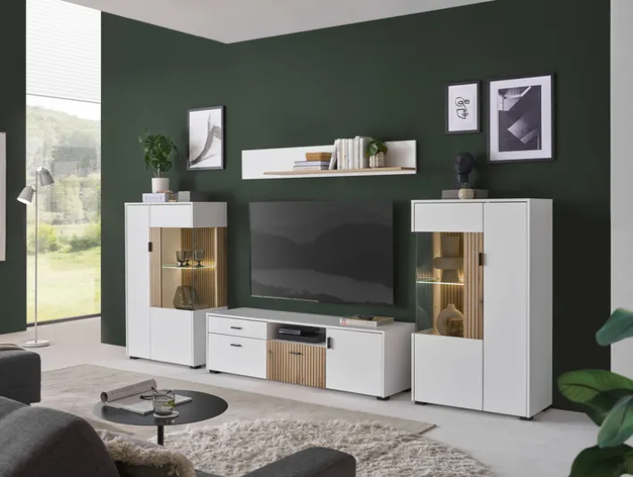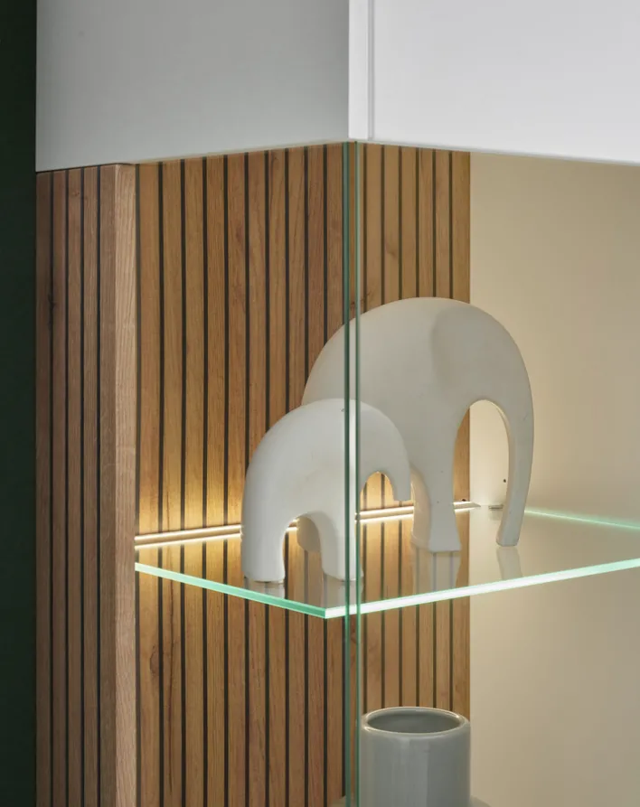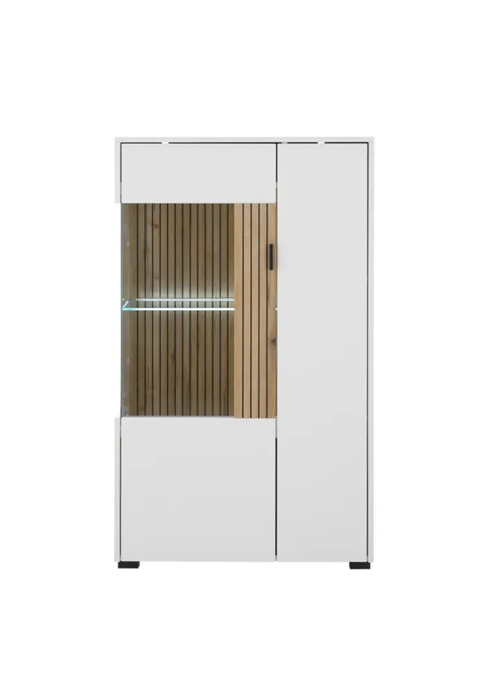 HUDSON ist eine 75 x 125 cm große Vitrine inklusive Schrankelemente in Weiß und Braun. Alternativ steht auch die Kombi aus Weiß und Schwarz bereit. Wer dem reizvollen Möbelstück noch mehr Flair verleihen möchte, sollte eine Beleuchtung integrieren.