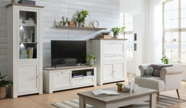 Die Vitrine verfügt über zwei Drehtüren, von denen eine mit Klarglas versehen ist, um den Blick auf die beleuchteten Innenfächer freizugeben. Die integrierte Beleuchtung setzt Ihre Dekorationen stilvoll in Szene. Die Griffe sind dezent und fügen sich harmonisch in das Gesamtbild ein. Das verwendete Material ist hochwertiges Pinienholz, das für seine Langlebigkeit und natürliche Ästhetik bekannt ist. Diese Vitrine ist die perfekte Ergänzung für jedes Wohnzimmer und bietet eine stilvolle Möglichkeit, Ihre Sammlerstücke zu präsentieren.