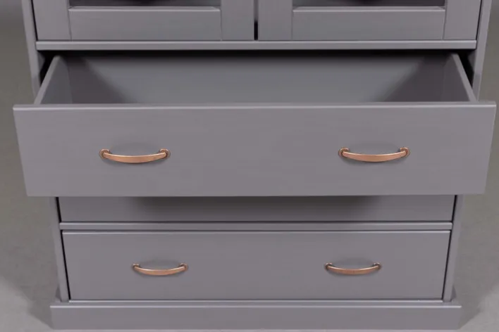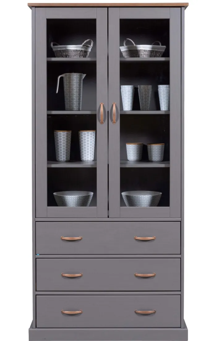 Die Vitrine NICLAS kombiniert das moderne Grau mit kupferfarbigen Griffen und einer in Kupferfarbe abgesetzten Deckplatte. Mit dieser attraktiven Farbkombination zieht das Möbelstück alle Blicke auf sich. Ein Highlight ist die Vitrine allerdings nicht nur optisch! Hinter ihren Glastüren bietet sie auf vier Ebenen ausreichend Platz für das schönste Porzellan und elegante Gläser. In den drei breiten Schubkästen bietet der Vitrinenschrank weiteren Stauraum für Servietten, Besteck und vieles mehr.