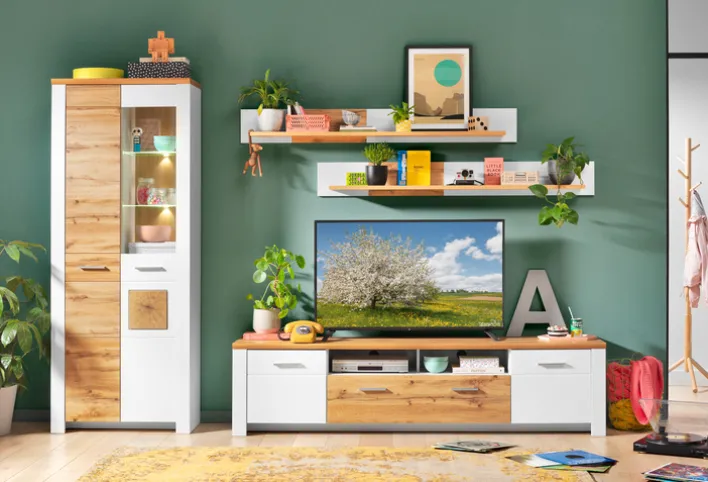 Ausgestattet mit zwei Drehtüren, verbindet sie geschlossene und offene Bereiche: Hinter den Klarglaseinsätzen lassen sich dekorative Elemente wirkungsvoll präsentieren, während der geschlossene Stauraum Ordnung schafft. Die integrierte Beleuchtung setzt Ihre Lieblingsstücke zusätzlich gekonnt in Szene.