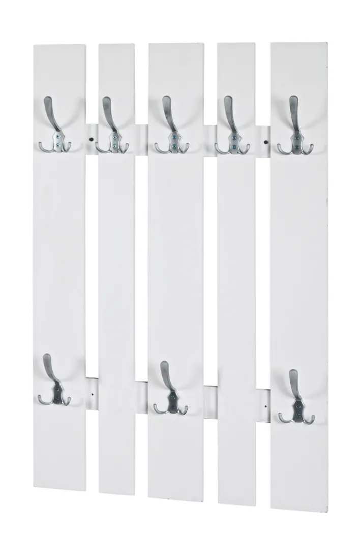 Diese Wandgarderobe misst 65 x 100 x 9 cm und besteht aus einer Holznachbildung in Weiß. Sie ist mit acht silberfarbigen Haken aus Stahl versehen.