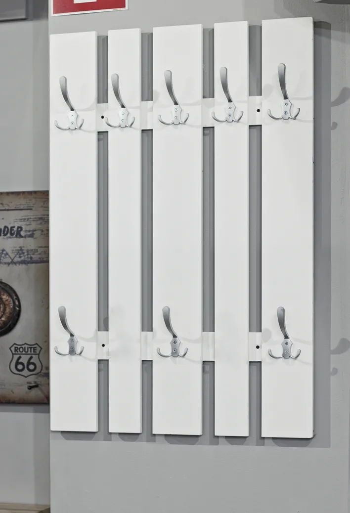 Das Gestell besteht aus mitteldichten Faserplatten (MDF) und zeigt fünf senkrechte Latten, die auf der Rückseite durch Querstreben miteinander verbunden sind. Auf jeder Latte befindet sich in der oberen Hälfte ein Haken, in der unteren Hälfte sind es insgesamt drei Haken. Jeder Haken bietet für mindestens drei Kleidungsstücke Platz, da er oben einen langen und darunter zwei kleinere Fortsätze besitzt. Somit ist die Wandgarderobe für Familien oder für Menschen, die oft Besuch bekommen, geeignet. Auch in einem Büro sieht sie nicht nur gut aus, sondern bietet auch den vielen Mänteln und Jacken Ihrer Besucher Raum.