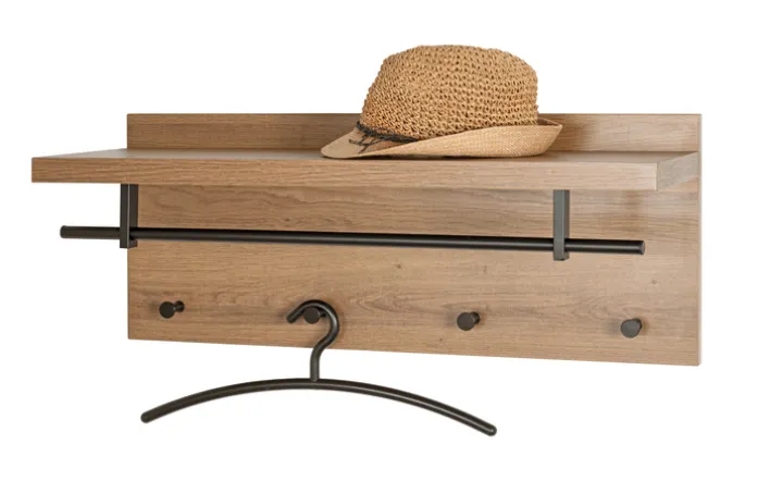 Diese Garderobe für die Wand eignet sich für den Innenbereich und kommt dort unter anderem im Eingangsbereich zum Einsatz. Als praktische Kleiderablage bietet sie Platz für Jacken, Mäntel, Schals und mehr. Die verschiedenen Kleidungsstücke können mithilfe eines Kleiderbügels an die integrierte Kleiderstange gehängt werden. Die Wandgarderobe besteht aus Eiche-Dekor und schwarz lackiertem Metall. Das Möbelstück ist mit einer Melaminharzbeschichtung überzogen und zudem 26 cm tief. Auf der Ablagefläche findet so zum Beispiel auch ein Sommerhut seinen Platz.