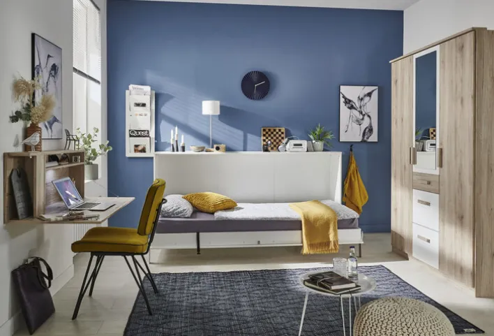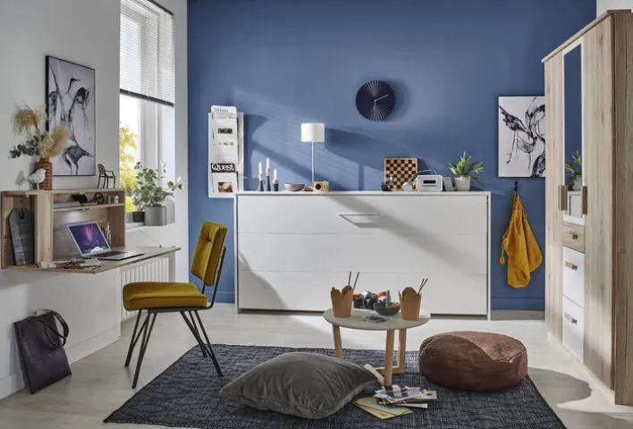 Das Wandklappbett STELLA mit einer Liegefläche von 90 x 200 cm ist eine platzsparende Lösung für kleine Jugend- oder Gästezimmer. Auch in 1-Zimmer-Appartements bewährt sich das Bett, das tagsüber in einem geschlossenen Aufbewahrungskasten verschwindet. Nach außen sichtbar bleibt eine dekorative weiße Front mit schmalem Griff.