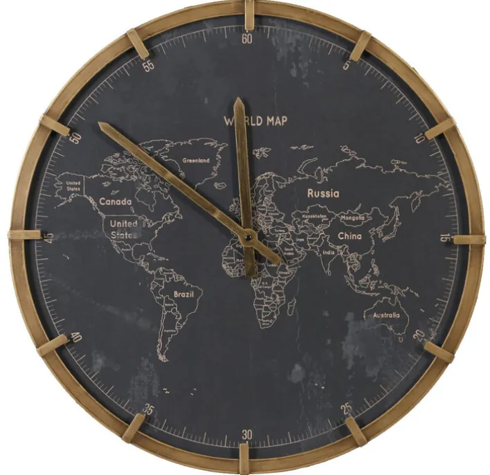 Die Wanduhr GLOBAL schmückt auf dem Zifferblatt eine Weltkarte mit goldfarbenen Umrissen auf einem grauen Hintergrund. Zeiger und Stundenskala der Wanduhr aus stabilem Eisen mit 58 cm Durchmesser sind ebenfalls in Gold gehalten.