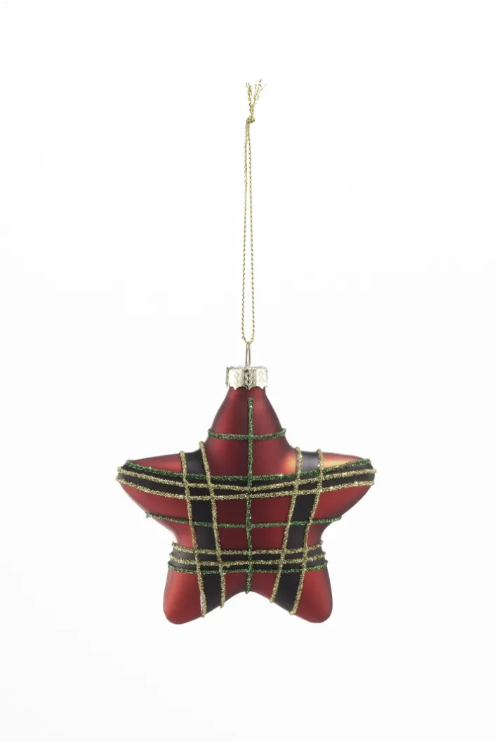 Dieser sternförmige Weihnachtsbaumschmuck aus der Serie MERRY CHRISTMAS besteht aus Glas und misst 8,7 cm in Länge und Breite sowie 8,6 cm in der Höhe. Das Gewicht beträgt 0,02 kg. Die Hauptfarbe ist Rot, ergänzt durch grüne und goldfarbene Akzente, die als glitzernde Linien in Karomuster auf der Oberfläche sichtbar sind. Die strukturierte Oberfläche und die glänzenden Verzierungen verleihen dem Ornament ein festliches Erscheinungsbild. Das Produkt eignet sich für den Innenbereich, insbesondere für das Wohnzimmer.