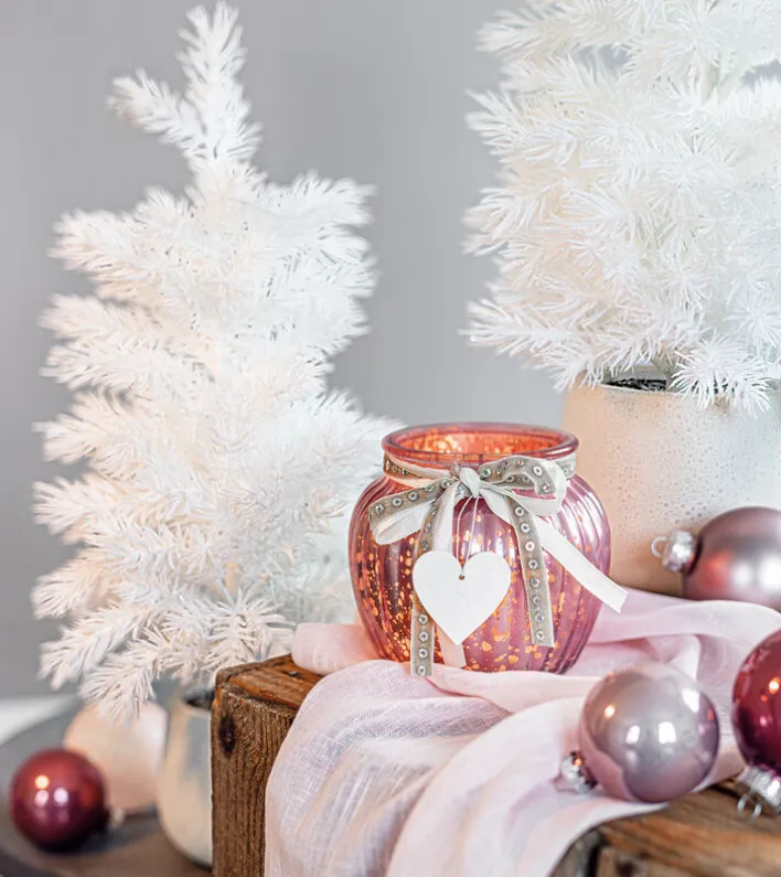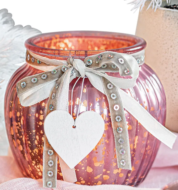 Verspielt und romantisch, angelehnt an die Form eines Bonbonglases, versprüht das Weihnachtsglanz Windlicht NORDISCHER WINTER by casaNOVA in der Farbe Rosa besonderen Glanz. Es ist aus geriffeltem Glas hergestellt und besitzt eine Höhe von 10,5 cm und einen Durchmesser von 11,5 cm. Das Weihnachtsglanz Windlicht NORDISCHER WINTER punktet mit einem nostalgischen Design. Ansprechende Details wie ein weißes Holzherz, Bänder mit funkelnden Pailletten und Schleifen vollenden die aparte Machart. Ob auf dem Fenstersims, der Anrichte oder auf dem festlich gedeckten Tisch: das Weihnachtsglanz Windlicht MÄRCHENWALD ist immer ein toller Blickfang. Besonders schön kombiniert es mit Interieur im Vintage Stil oder Shabby Chic.