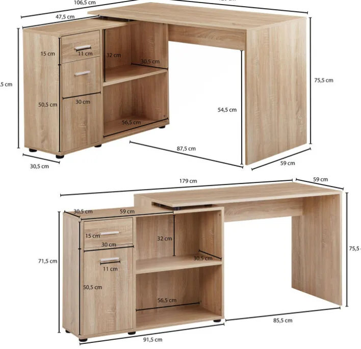 Der Winkelschreibtisch lässt sich den eigenen Bedürfnissen und den Platzverhältnissen anpassen. Er kann gewinkelt oder ausgestreckt stehen. Auf der Schreibtischfläche ist Platz zum Arbeiten, für den Computer und die Schreibtischlampe, während Unterlagen auf der Abstellfläche liegen können. Stauraum ist mit zwei offenen Fächern, einer Schublade und einem Schrankfach mit Drehtür reichlich vorhanden. Hier lassen sich alle Arbeitsutensilien verstauen. Der Schreibtisch hat ein dekoratives Sonoma Eiche Dekor, das mit Melaminharz beschichtet ist.