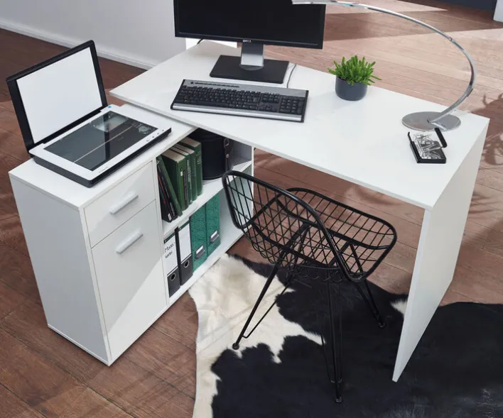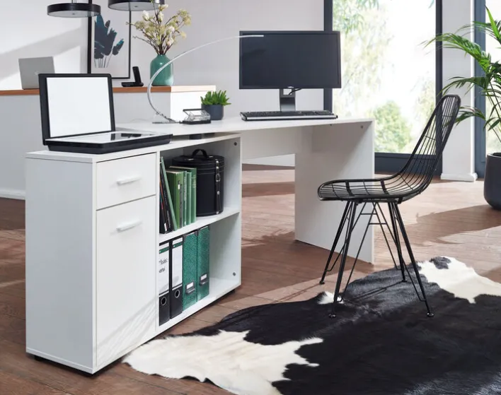 Mit Abmessungen von 120 x 107 cm zeigt das Modell in Weiß, wie geräumig und doch kompakt ein Winkelschreibtisch sein kann. Als Materialien kommen Holznachbildung und Kunststoff zum Einsatz. Alternativ können die beiden Schreibtisch-Teile in einer Geraden mit einer Länge von knapp 180 cm angeordnet werden.