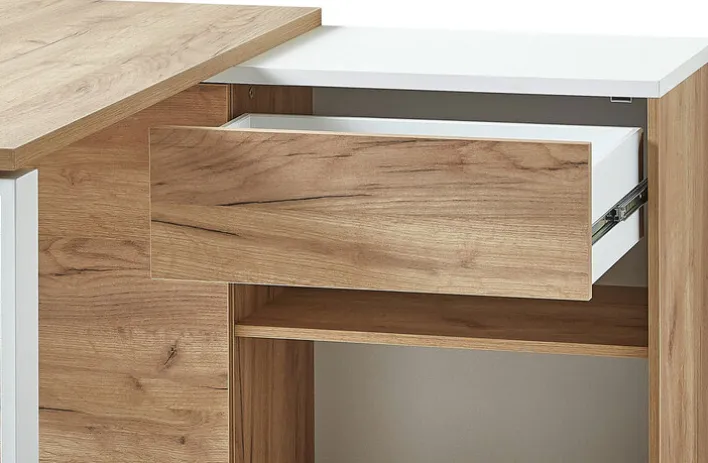Der funktionelle Winkelschreibtisch LION mit den Maßen 117 x 120 cm ist die praktische Ecklösung für kleinere Jugend- oder Arbeitszimmer. Durch seine Oberflächen in der Farbe weiß und Navarra-Eiche ist der funktionell gestaltete Arbeitsplatz sehr gut in bereits bestehende Einrichtungen integrierbar. Die große Schreibtischplatte und die Oberplatte des Sideboards bieten viel Platz für verschiedene Arbeitsmaterialien. Zusätzlicher Stauraum steht in einem offenen Fach mit Einlegeboden, einem Schubkasten und einem Schrank mit Schiebetür zur Verfügung.