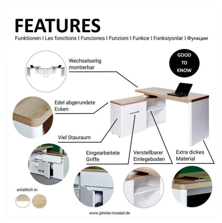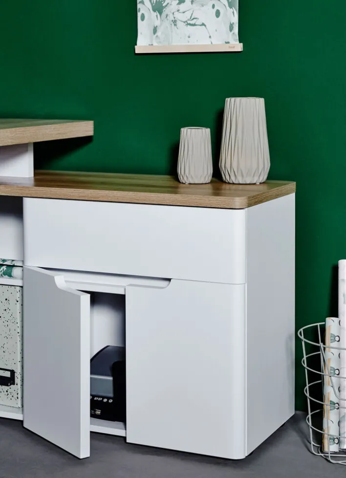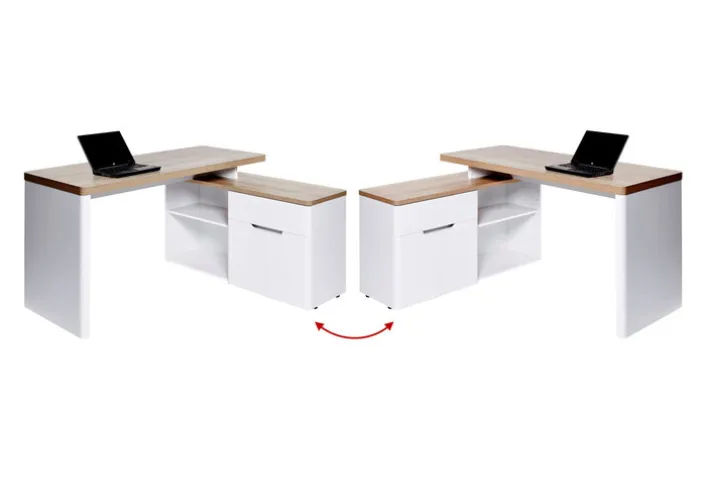 Öffnen aller geschlossenen Fächer, ohne dass auf dem hellen Oberflächendekor Fingerabdrücke entstehen. Weiterhin ist es möglich, den Schreibtisch individuell zu gestalten. So kann der Untertisch auch auf der anderen Seite montiert werden.