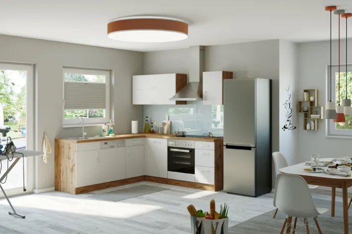 Einfach perfekt! Bei dieser platzsparenden Küchenzeile sind Backofen, Dunstesse und Geschirrspüler bereits integriert. Durch die L-Form ist die ODENSE Kombination ein Traum für alle, die kurze Arbeitswege in der Küche bevorzugen. Auch Wände mit Fenstern lassen sich dank der einzelnen Module bestens nutzen. Die Optik der Winkelzeile überzeugt ebenfalls, liegen doch weiße Küchen mit holzfarbenen Elementen voll im Trend. Die Küchenzeile wird zerlegt geliefert.