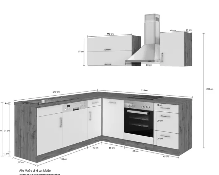 Die Winkelzeile ODENSE misst 210 x 210 cm. Die Arbeitsflächen sind 60 cm tief, die Höhe der Küchenzeile beträgt 200 cm. Fronten, Sockel und Arbeitsplatte sind in Wotan Eiche Dekor und Weiß. Sie verfügt über höhenverstellbare Füße.
