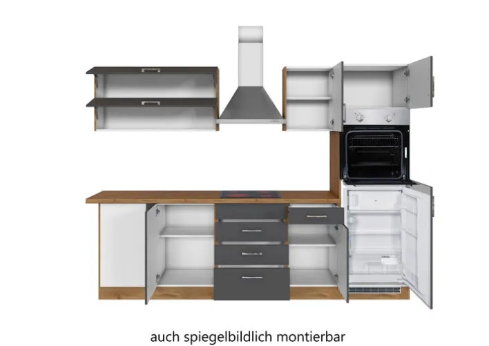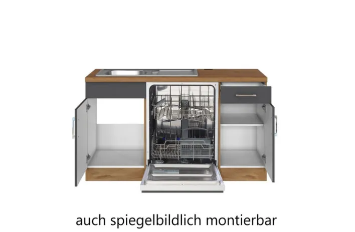 So viel Küche auf kleinem Raum! Die Winkelzeile ODENSE ist perfekt für alle, die sie auch an einer Wand mit Fenster stellen wollen. Bei Bedarf können Geräte und Schränke auch seitengespiegelt montiert werden. Zum Design mit der trendigen Farbe kommt noch jede Menge Komfort, etwa durch die höhenverstellbaren Füße und die funktionellen Schubladen. Küchengeräte wie Geschirrspüler, Kochfeld und Dunstesse, Backofen und Gefrier-Kühl-Kombination sind bereits in die Winkelzeile integriert. Sie wird zerlegt geliefert, bitte Hinweise am Produkt beachten.
