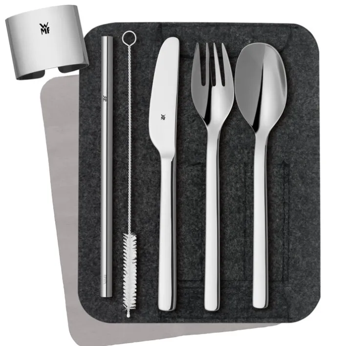 Unterwegs bestens ausgestattet sind Sie mit diesem To-Go Besteckset aus dem Hause WMF. Neben einer Gabel, einem Messer und einem Löffel beinhaltet das Ensemble aus rostfreiem Cromargan einen Strohhalm mit passender Reinigungsbürste. Alle Teile der Serie finden in dem eleganten Etui in grauer Filzoptik Platz. Einzelne Einstecktaschen halten das Besteck an Ort und Stelle und verhindern störende Klappergeräusche.