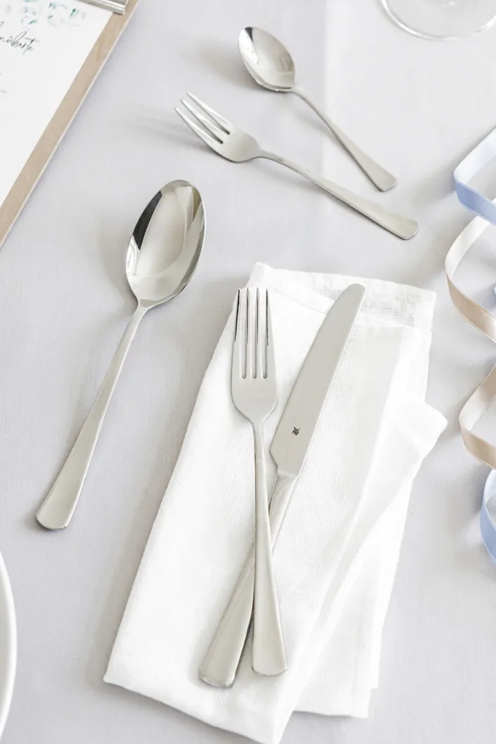 Dieses 30-teilige Besteckset der Serie DENVER von WMF besteht aus hochwertigem Edelstahl und ist für den Einsatz in der Küche konzipiert. Das Set präsentiert sich in einem silberfarbenen Farbton mit glänzender, spiegelnder Oberfläche und überzeugt durch eine klassische, zeitlose Formgebung ohne auffällige Muster. Die einzelnen Besteckteile zeigen klare, gerade Linien und leicht abgerundete Kanten, was ihnen eine schlichte und moderne Anmutung verleiht. Die ergonomisch gestalteten Griffe liegen gut in der Hand und ermöglichen eine angenehme Nutzung im Alltag.