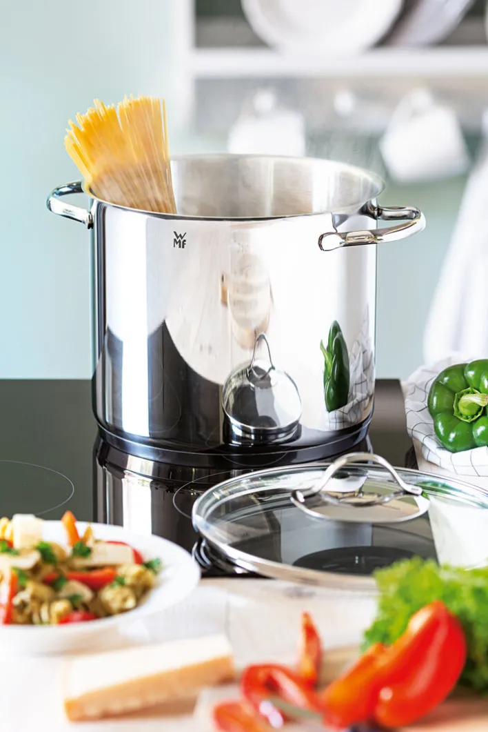 Der Gemüsetopf mit Glasdeckel hat einen Durchmesser von 24 Zentimeter und ein Fassungsvermögen von ca. 8,8 Liter Inhalt. Er ist optimal für Herdplatten mit einem Durchmesser von 22 Zentimeter geeignet und kann auch für moderne Induktionsherde genutzt werden. Der Topf ist aus rostfreiem Cromargan Edelstahl 18/10 hergestellt und lässt sich sehr leicht pflegen. Durch einen extra hohen Rand und einen gut schließenden Deckel werden Ihre Lebensmittel garschonend gekocht oder gedünstet. Dank seinem großen Fassungsvermögen und der geraden Form kann der Topf nicht nur für spezielle Gemüsesorten, wie zum Beispiel Blumenkohl oder großblättrigen Spinat, sondern auch für kräftige Eintöpfe, Suppen oder Spaghetti verwendet werden. Der WMF Gemüsetopf ist auch backofengeeignet und kann leicht in der Spülmaschine gereinigt werden.