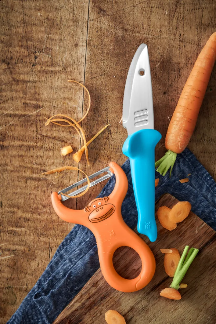 Sehr gut ist das zweiteilige ANIMAL Kinder-Koch-Set aus dem Hause WMF zum Schnippeln von Gemüse oder beispielsweise dem Schälen von Zitronenabrieb und Äpfeln geeignet. Beide Werkzeuge haben eine Anti-Rutsch-Beschichtung und sind rostfrei, zudem lassen sie sich nach dem Kochen mühelos in der Spülmaschine reinigen.