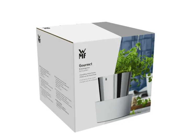 Der WMF Kräutergarten besteht aus Übertopf, Wassertank und Glasfaserdocht. Der silberfarbige Cromargan Edelstahl 18/10 ist rostfrei und poliert.