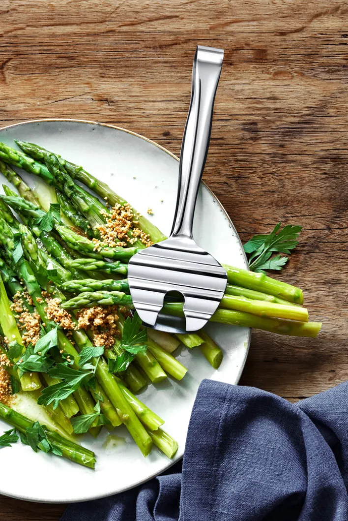 So landet der Spargel sicher auf dem Teller – formschön und sehr elegant. Hohe Funktionalität und ein schlichtes, aber extrem elegantes Design kommen bei der Spargelzange aus Edelstahl zusammen – typisch für WMF. Die silberfarbige Zange ist aus Cromargan Edelstahl 18/10 gefertigt und wiegt 75 Gramm. Mit diesem leichten Gewicht liegt sie auch noch gut in der Hand und lässt sich leicht bewegen. Das Material ist spülmaschinengeeignet – auch das kennt man von WMF. Die großzügig gestalteten Greifflächen der Zange stellen sicher, dass auch geschmolzene Butter, leckere Soße oder Kräuter mit dem Spargel auf dem Teller landen.