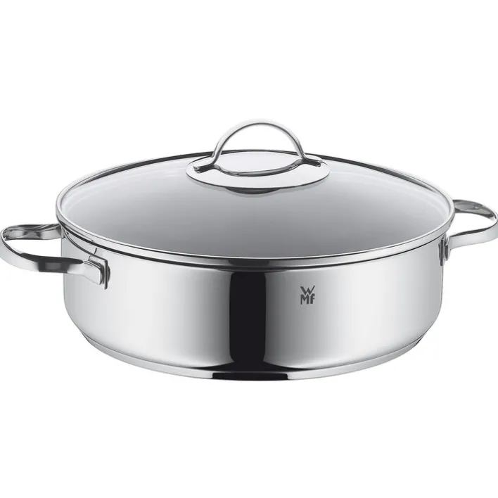 Die WMF Bratpfanne aus der Serie DEVIL vereint modernes Design mit hoher Funktionalität. Mit einem Durchmesser von 28 cm und einer Höhe von 10 cm bietet sie ein Fassungsvermögen von 5.000 ml, ideal für die Zubereitung größerer Mahlzeiten. Die Pfanne besteht aus hochwertigem Edelstahl, das rostfrei und poliert ist, was nicht nur für eine ansprechende Optik sorgt, sondern auch für Langlebigkeit und einfache Reinigung. Die silberfarbene Oberfläche verleiht der Pfanne ein elegantes Aussehen, das in jede moderne Küche passt.