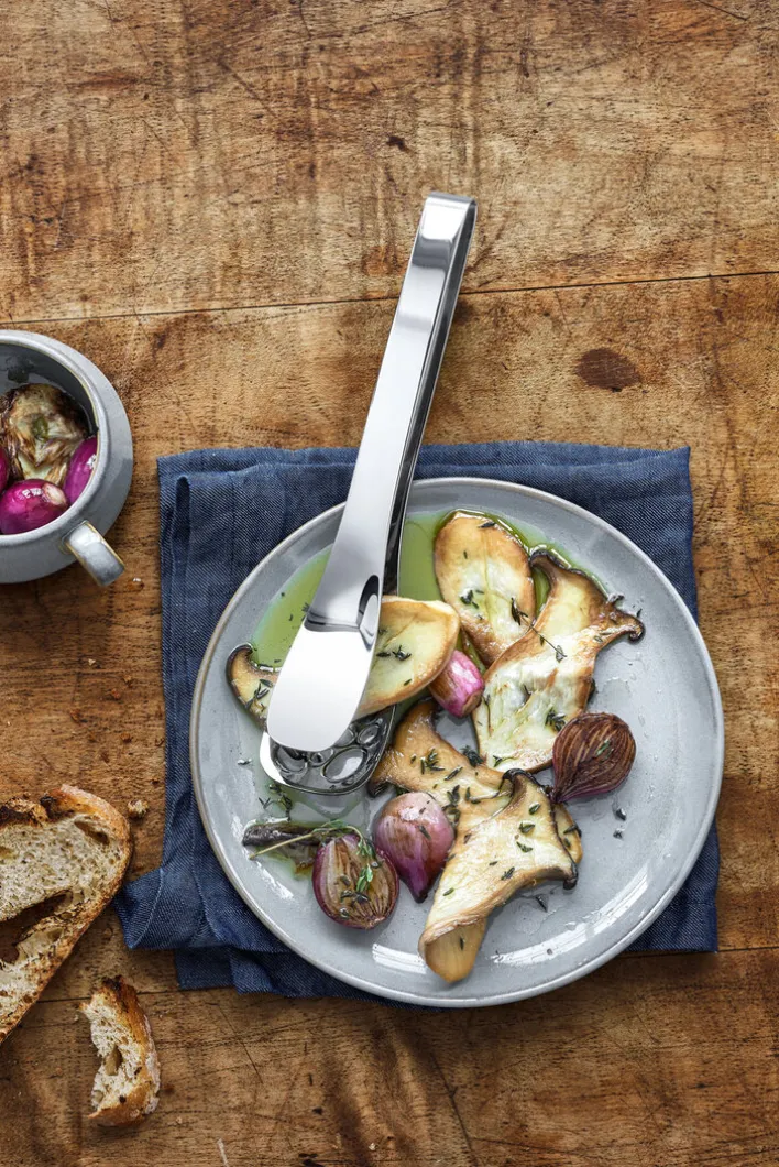 Mit der Servierzange NUOVA lässt sich Gästen auf ansprechende Weise auftischen. Mithilfe des Spezialbestecks können Salate, Nudeln oder Fleisch mit Leichtigkeit auf den Teller gehoben werden. Die miteinander verbundenen Griffe sind federnd, was zu einem optimalen Handling führt. Überschhüssiges Wasser, Fett oder Marinade kann durch die Löcher in der unteren Laffe abtropfen, sodass diese Flüssigkeiten nicht mitserviert werden müssen.