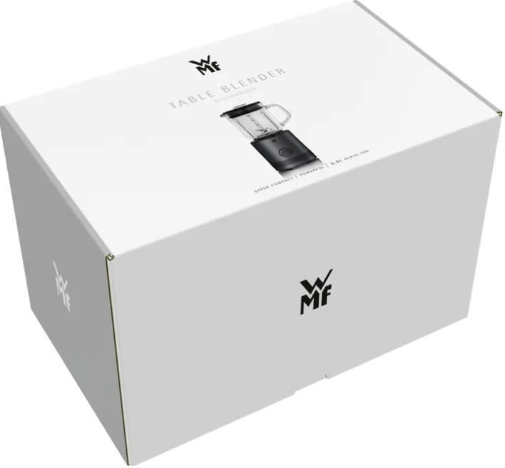 Der Standmixer aus der Serie KIMI DEEP von WMF überzeugt mit einer kompakten Bauweise und modernem Design. Das Gerät ist in einem matten Schwarz gehalten, wobei der Mixbehälter aus transparentem Glas besteht. Die Füllmengen-Skala ist klar ablesbar und der Deckel ist ebenfalls schwarz mit einer transparenten Einfüllöffnung in der Mitte. Der Edelstahlfuß sorgt für Stabilität und ein klares Erscheinungsbild. Das Gehäuse wirkt glatt und hochwertig verarbeitet, die Bedienelemente sind übersichtlich angeordnet und lassen sich einfach bedienen.
