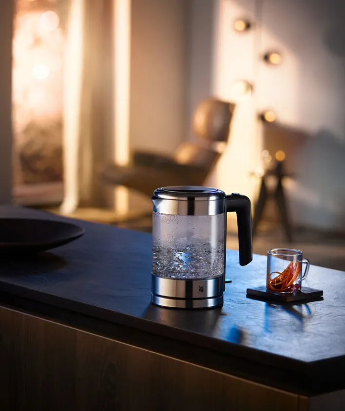 Der kleine Wasserkocher aus der beliebten Serie KÜCHENMINIS von WMF überzeugt durch sein elegantes Design und ist besonders praktisch. Im Handumdrehen sind bis 1000 ml heißes Wasser bereitet, das zum Kochen von Tee, Kaffee oder auch für eine Suppe geeignet ist. Durch die integrierte Kochstoppautomatik mit Deckelverriegelung ist das Kochen von Wasser kinderleicht und sicher. Ein Trockenlauf- und Überhitzungsschutz ist ebenfalls eingebaut.