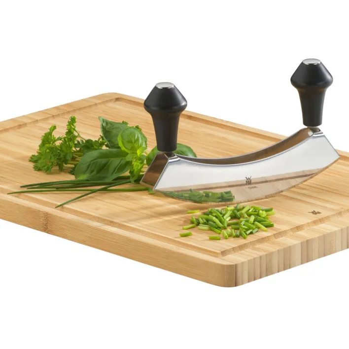 Das Wiegemesser hat handliche und ergonomisch wertvolle Griffe auf beiden Seiten, um die Kraft perfekt auf das Wiegemesser übertragen zu können. Die sehr scharfe Klinge des Wiegemessers ist aus speziellem, langlebigem Klingenstahl gefertigt. Das Wiegemesser eignet sich bestens zum filigranen Zerkleinern von Kräutern oder anderen Gewürzen. WMF bietet neben dem normalen Wiegemesser, auch Einhand-Wiegemesser oder Wiegemesser mit zwei Klingen an um die Zutaten noch schneller verarbeiten zu können.