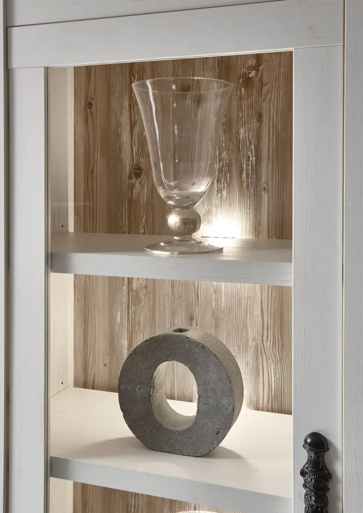 Die Wohnwand FLORENZ vereint klassisches Design mit einem Hauch von Landhausstil und bietet eine elegante Lösung für Ihr Wohnzimmer. Die Kombination aus weißem Pinien-Dekor und Applikationen in Oslo-Pinie verleiht dem Möbelstück eine warme und einladende Ausstrahlung. Die Wohnwand besteht aus vier Teilen: zwei Vitrinen, einem Lowboard und einem Wandboard. Die Vitrinen bieten mit ihren Glastüren und den offenen Fächern ausreichend Platz zur Präsentation Ihrer Lieblingsstücke. Das Lowboard ist ideal für Ihre Unterhaltungselektronik und bietet zusätzlichen Stauraum in zwei Schubkästen.