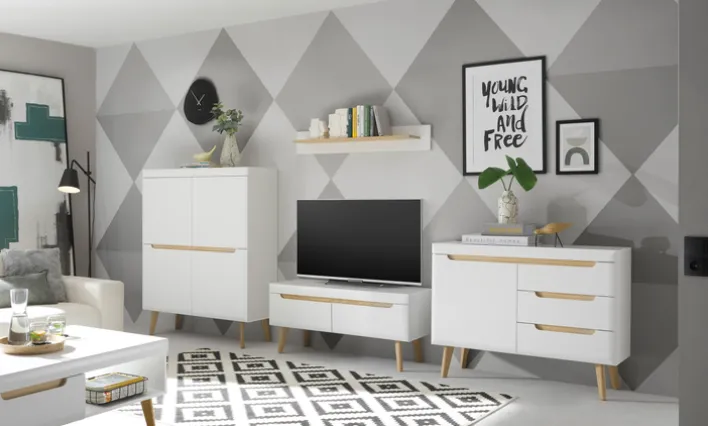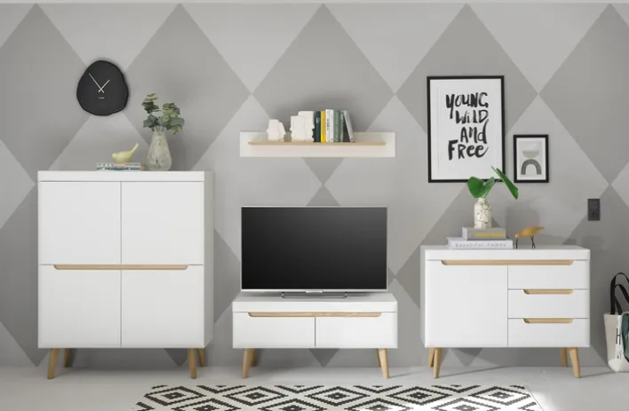 Entdecken Sie die Wohnwand „SVANTE TORGE“, die Funktionalität und Stil in Ihrem Zuhause vereint. Diese Wohnwand besteht aus vier Teilen: einem Lowboard, einem Sideboard, einem Highboard und einem Wandboard. Die Hauptfarbe ist Weiß, ergänzt durch Dekor in Eiche, was einen harmonischen und zeitlosen Look schafft.