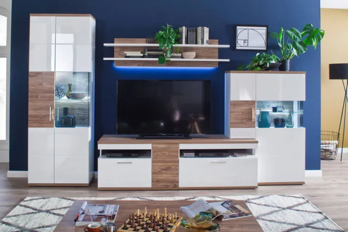Die attraktive, 320 cm breite Wohnwand bringt modernen Charme und frischen Wind in Ihr Zuhause! Es vereint praktische Funktionalität mit exklusivem, hochwertigem Design.
