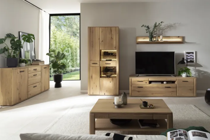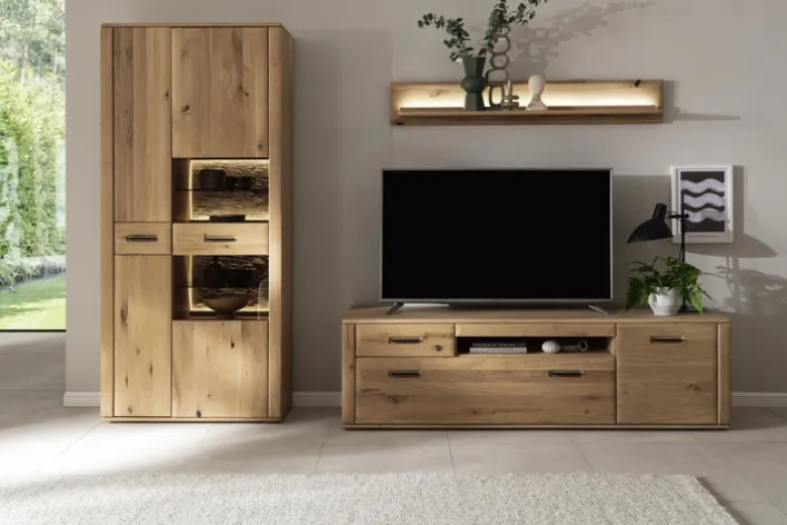 Die 3-teilige Wohnwand ALENTO aus teilmassiver Balkeneiche ist 302 x 207 cm groß und schenkt dem Wohnzimmer sofort eine noch gemütlichere und schönere Atmosphäre. Außerdem begeistert sie mit sehr durchdachten und modernen Details.
