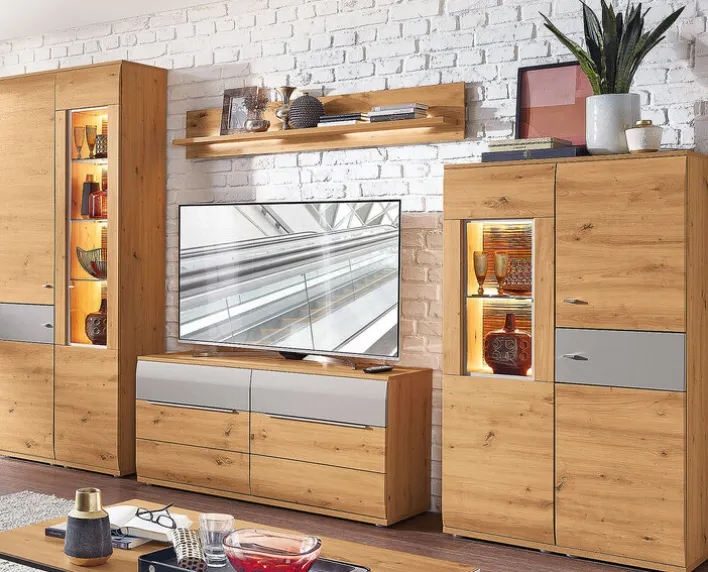 Das Set besteht aus sechs Teilen, darunter ein Wandboard, zwei Highboards, ein Lowboard und zwei Schränke. Die Highboards und Schränke bieten ausreichend Stauraum mit insgesamt acht Drehtüren. Die klaren Linien und die matte Optik der Fronten harmonieren perfekt mit der natürlichen Holzstruktur. Die Glasvitrinen sind ideal, um dekorative Elemente stilvoll zu präsentieren. Diese Wohnwand ist nicht nur ein Blickfang, sondern auch eine praktische Lösung für die Organisation Ihres Wohnraums.