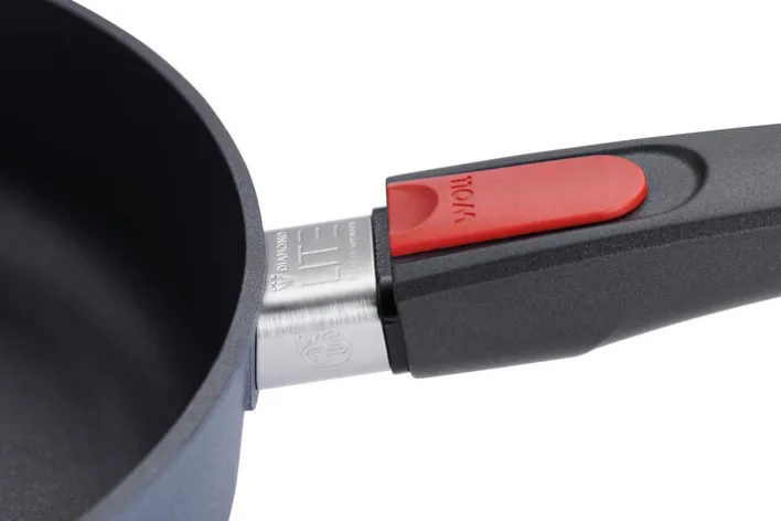 Die WOLL Gusspfanne DIAMOND LITE besteht aus handgegossenem Aluminium und hat ein Fassungsvermögen von 4,75 Liter. Durch die ultraharte Diamantversiegelung ermöglicht die Pfanne ein fast fettfreies Kochen. Darüber hinaus ist die Versiegelung schnittfest und sehr pflegeleicht. Die Reinigung in der Spülmaschine ist somit kein Problem. Punkten kann die Gusspfanne zudem mit ihrer Energieeffizienz, denn sie heißt sich sehr rasch auf. Das Highlight ist jedoch der abnehmbare Griff. Ohne Griff ist die Pfanne als Ofenform verwendbar und bis zu 250 °C backofenfest.