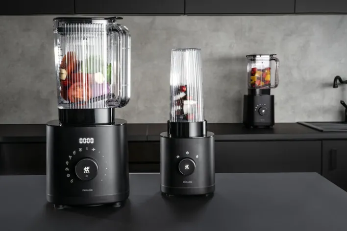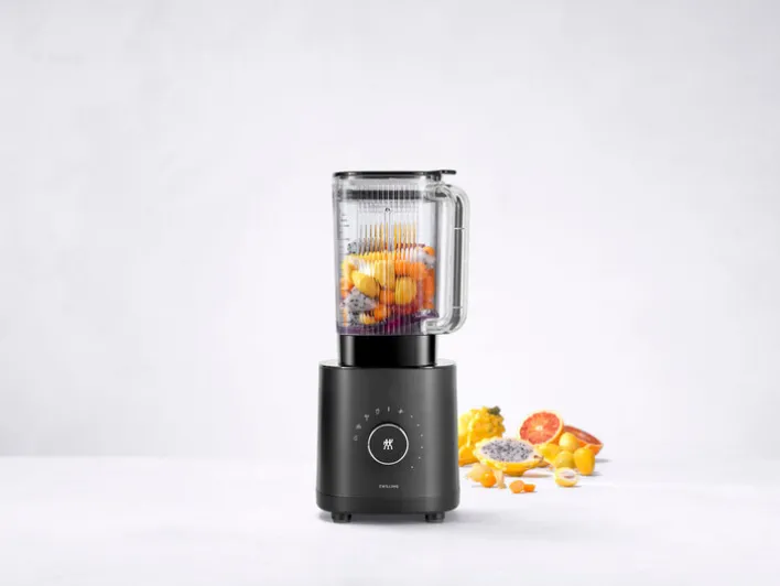 Der schwarzfarbige universal Standmixer aus der vielseitigen ZWILLING ENFINIGY Serie hat ein Volumen von 1400 ml und eignet sich optimal für Shakes, Smoothies oder auch zum Crashen von Eis. Ausgestattet mit einem leistungsstarken AC Motor und der speziell entwickelten Kreuzklinge mit speziellem Wellenschliff und Piranha-Zahnung, ist das Zerkleinern von Obst, Gemüse oder Eis ein Kinderspiel. Dank der integrierten Sicherheitsverriegelung startet der Standmixer nur, wenn der Deckel richtig aufgesetzt wurde.